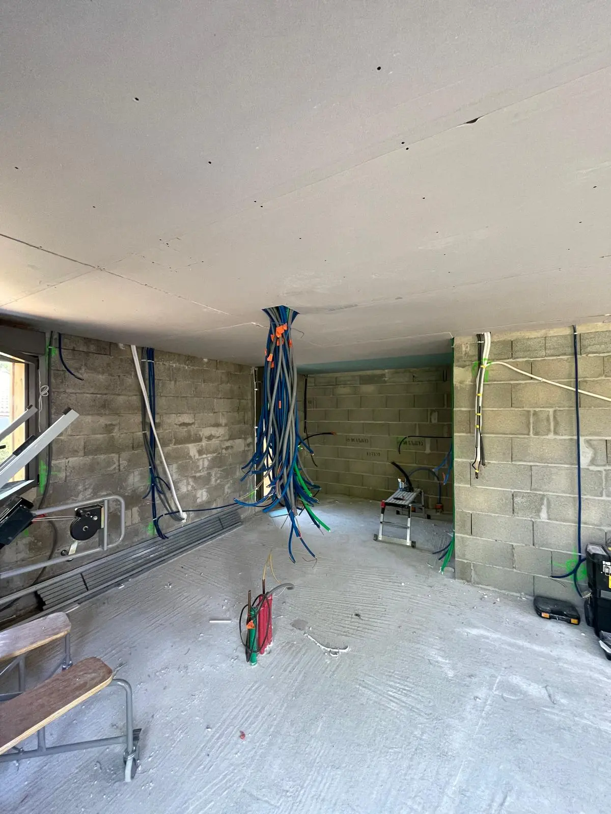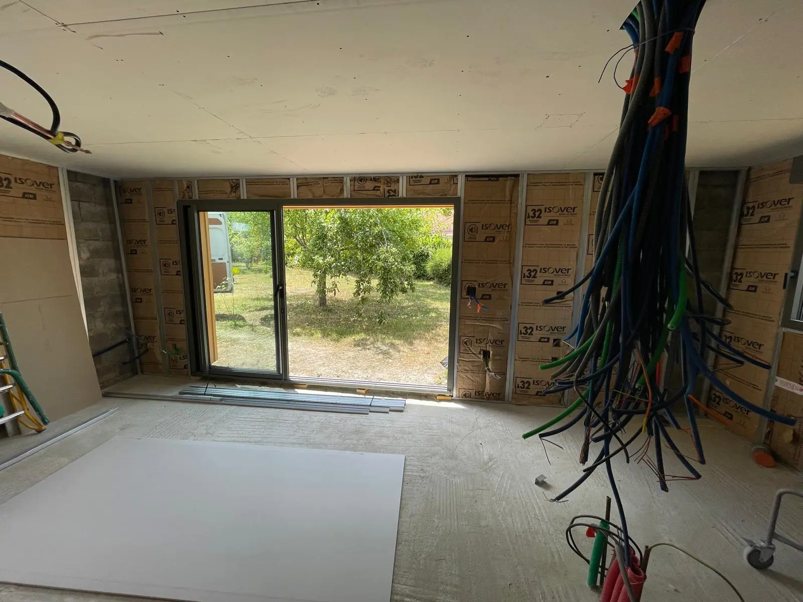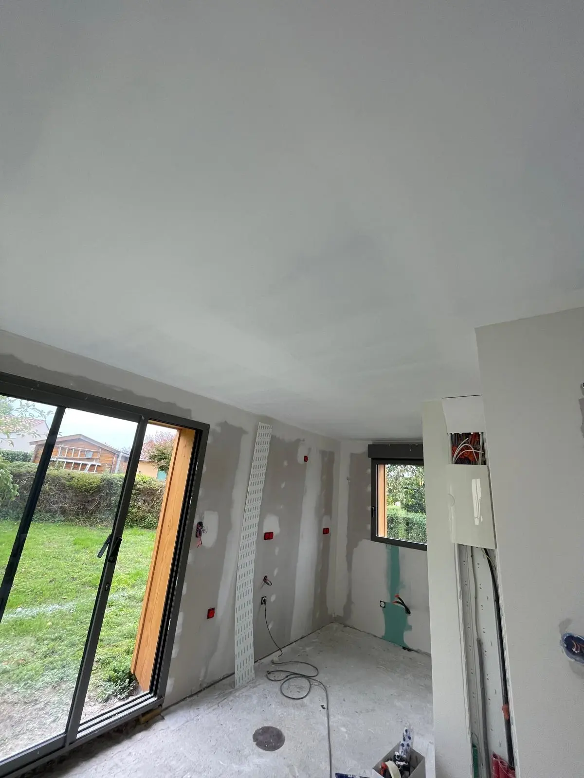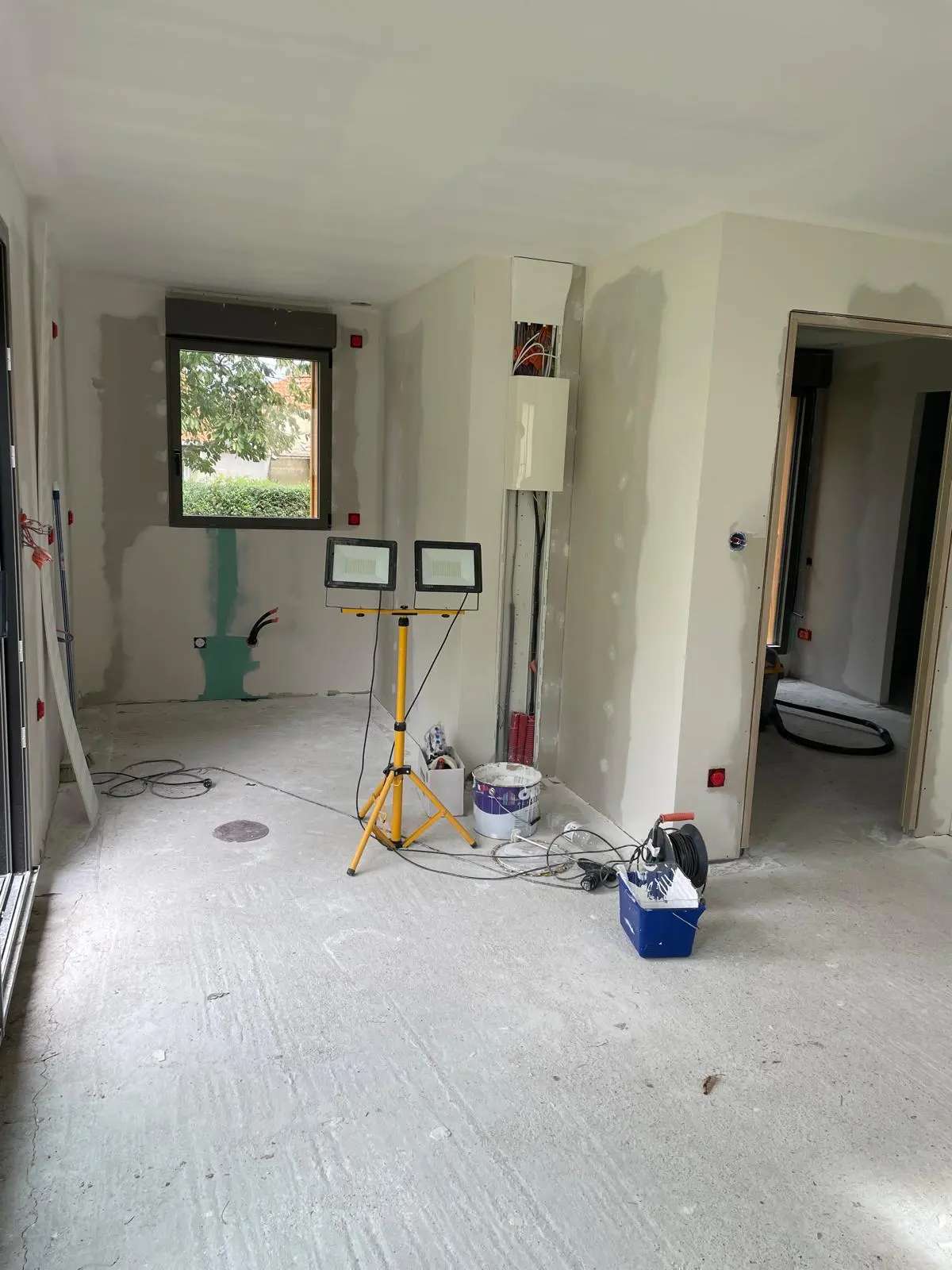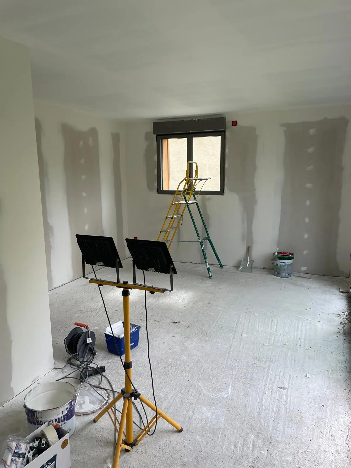 La cliente souhaitait diviser son garage en deux parties et créer un studio pour accueillir des invités. Il fallait isoler,plaquer les murs périphériques,, créer des cloisons de séparation, refaire le plafond, peindre l’intérieur